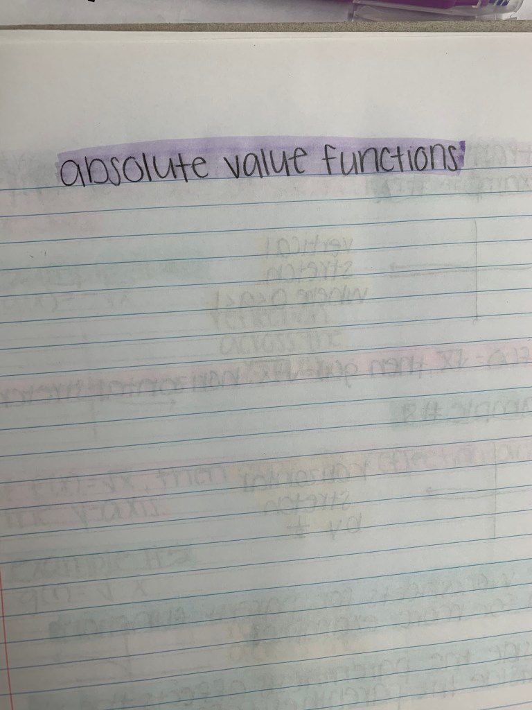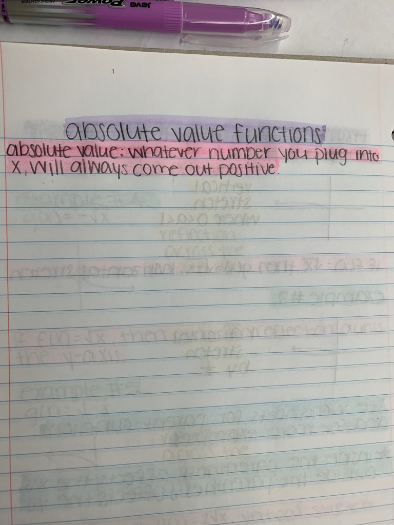 First day of senior year, I walk into my second hour class, honors pre-calculus. This is the most advanced math class I have been in up until that point. I sit through the first class and realize that the teacher does not give notes like any other teacher I have ever had. Mr. Suydam, my teacher, gave the title of notes and example problems. Anything else we needed to know he said out loud. I understand where that worked for him, but it did not work for me. I knew after that first class that I needed to take more organized and cohesive notes. I started by using colored pens, which worked, until I made a mistake. Then I moved to just writing each thing differently. I would write the titles slanted and any definitions in cursive, but that became hard to read. It wasn’t until university that I started to use highlighters instead of pens. I tinkered around with the large amount of colored pens I had in high school and grew to where I am at now. I have grown a lot in my note taking skills since Mr. Suydam’s second hour honors pre-calculus class. Having organized and legible notes really helped when someone else needed to copy my notes. I hope this helps you in your note taking and the overall appearance of your notes.